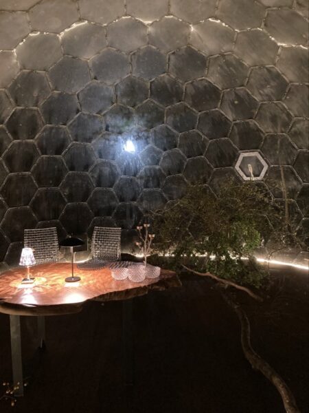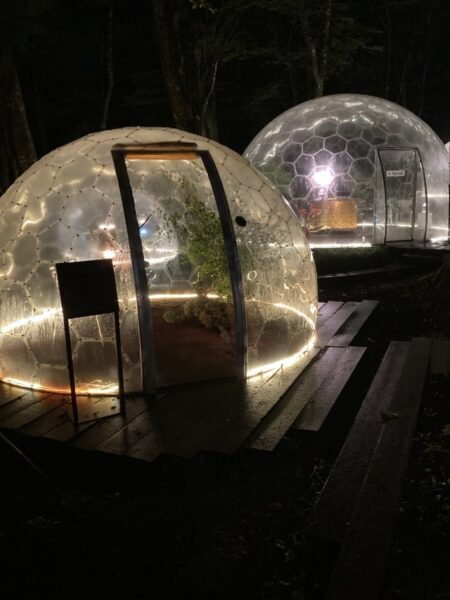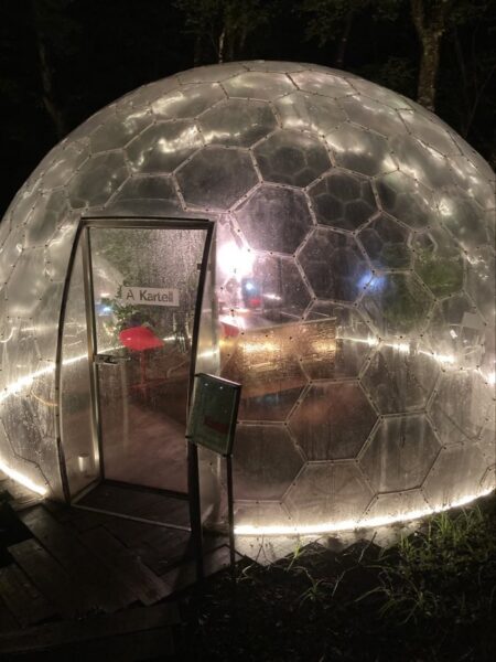 シェフと私の二人だけで、全ての仕込みから、調理、盛り付けを担当しましたので、残念ながら、お料理のお写真は一枚もとる時間がなかったのですが、ちょっとした休憩の間に、涼しい夜の箱根の樹々の中に浮かび上がるドーム型の展示スペースのお写真を撮らせてもらいました。