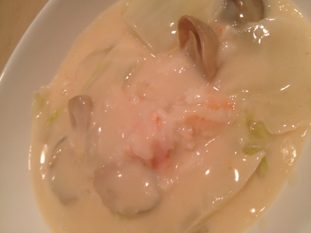 今回の食材はシンプルにずわいがに、白菜、そしてフクロタケ。ソースはエバミルク(無糖のコンデンスミルク)とオイスターソースがベースのコクのあるお味です。